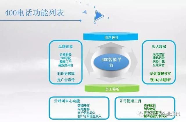 1、不占线:谁能受得了打一个公司联系电话打一个占线一次,再打一个居然还占线!400电话,呼入立即多线转接,等待期间可以听到美妙的企业宣传乐,绝对不错过任何商机!