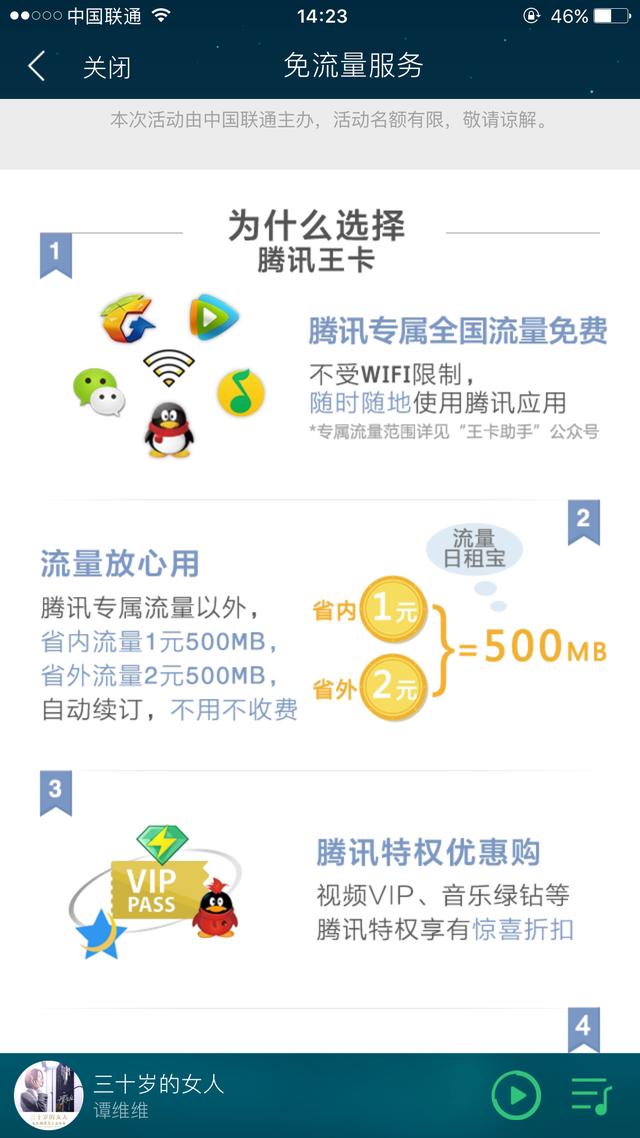 去年10月,腾讯携手中国联通发布了一款“腾讯大王卡”——针对腾讯应用的定向流量优惠套餐。用户在使用腾讯应用,比如微信、QQ、腾讯视频、QQ音乐、腾讯游戏时产生的流量,全部免费。根据官方介绍,“腾讯大王卡”月付19元,可享受全国无漫游服务,赠送来电显示,中国大陆境内接听全部免费。流量方面1元/500MB省内流量、2...