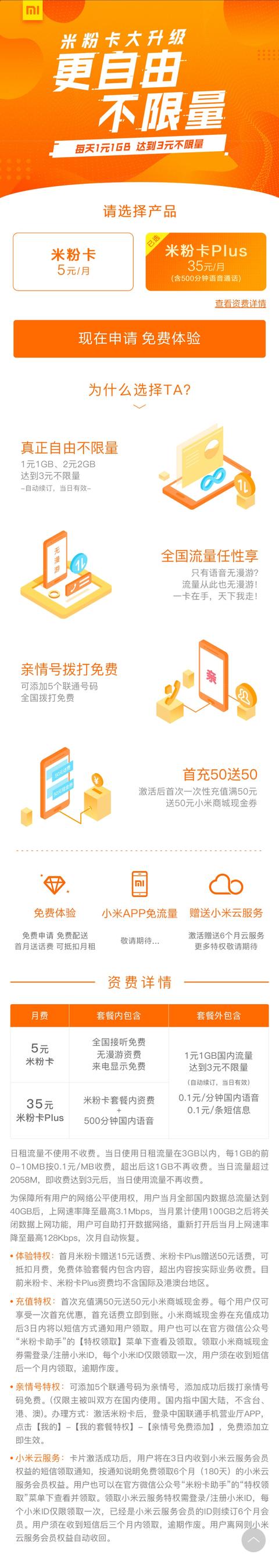 米粉卡是小米公司携手中国联通、中国电信推出的互联网套餐,其主打的是流量不限量。5月10日,米粉卡宣布:即日起,所有米粉卡用户将全面自动升级。本次升级变化:1元日租卡由省内流量1元/800M每天升级为全国流量1元/800M每天;3元日租卡由省内流量3元/天不限量升级为全国流量3元/天不限量(1元和3元全...