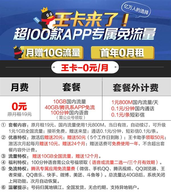 日前,有天猫商城推出了腾讯王卡优惠活动,原19元/月的大王卡首年0月租,而且每月赠10GB流量,连赠12个月。套餐内容:原月租19元,国内流量使用1元800M,当日有效,自动续订,可升级1元1GB全国流量;接听免费,赠送来显;通话0.1元/分钟,短彩信0.1元/条。优惠特权:激活后赠送20元;赠送50...