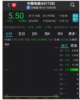 涨停、跌停、再跌停、暴跌、暴跌……回A上市以来,“巨无霸”中国电信股价走势上演了“惊天”反转戏码——上市首日,中国电信开盘后跳水,一度逼近发行价,随后可能是游资投机,股价直线拉升至涨停,单日涨幅近34.88%;23日,全体跌停,封单超千万手;24日,全日跌停,封单数百万手;25日,在电信出面“救市”,稳定了下局势...