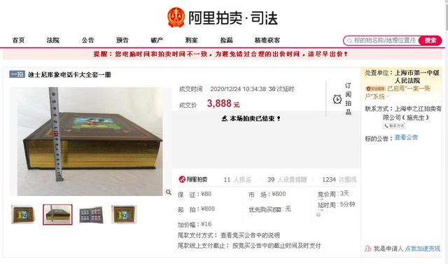 2020年12月24日10:29,经过58次竞价和30次延时的竞拍,迪士尼形象电话卡大全套一册以3888元在阿里拍卖平台拍卖成交。该标的评估价为800元,拍卖成交价高于评估价3000元。整场拍卖共吸引11人参与报名,39人设置提醒,共有1234次围观。本次拍卖由上海市第一中级人民法院作...