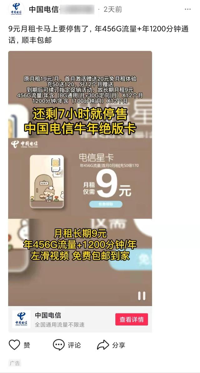 喏,广告文案写的是「9元月租卡,年456G+年1200分钟通话」,封面配图最大字号的文案写的则是「还剩7小时就停售的绝版卡」。