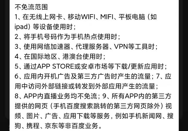 不免流的限制还有一大堆,平板、开热点、直播业务、第三方网页以及下载/更新应用等等,通通用不了定向流量。