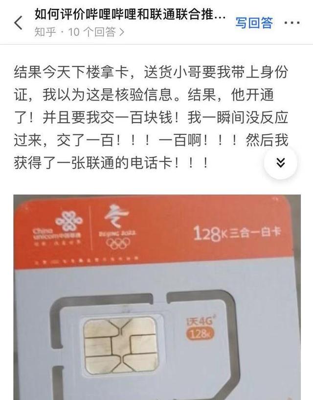 在黑猫投诉平台上,关于联通跟B站联合推出的哔哩哔哩免流卡的投诉有56条。其中,不少消费者反映,曾遭遇过被“强制收费、强制开通”的问题。有消费者投诉,在B站上看到“免费兑换大会员”的广告,上面写着免费注册领取包邮,在填写个人信息等资料后,收到工作人员送过来的电话卡。工作人员要求消费者激活该电话卡,并支付50或100元的话费。有消费者拒绝充值话费后,第二天手机提示欠费,联通客服要求将欠费缴纳,不然将会降低个人信用。