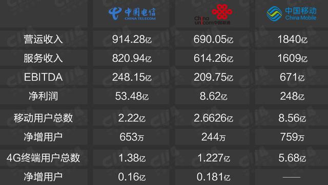 2017年第一季度三大运营商公布数据来看,中国移动营收1840亿,净利润248亿,而中国联通营收690亿,净利润8.62亿。