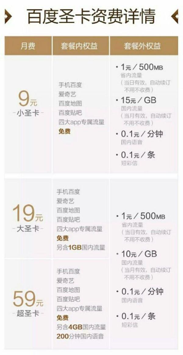 据了解,百度圣卡是百度与联通公司联合推出的无限流量卡产品。用户首月可以免费体验,月费分为9元(百度小圣卡)、19元(百度大圣卡)、59元(百度超圣卡)三档。