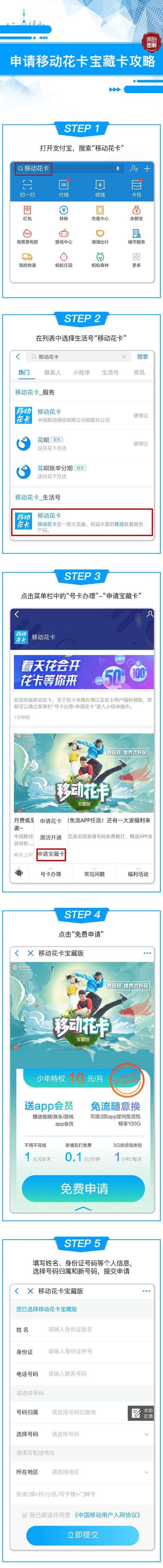 新用户可通过支付宝生活号“移动花卡”、微信公众号“移动花卡”或中国移动App申请移动花卡宝藏卡。