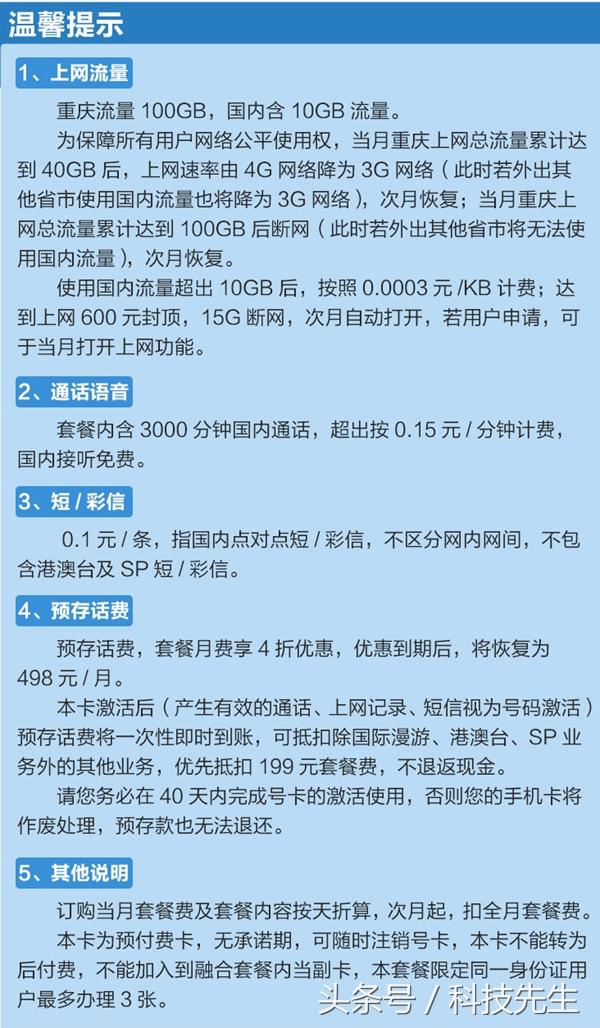 该套餐包含:本地流量100G、国内10G流量、3000分钟通话。据了解,该套餐目前价格为199元,与联通冰淇淋套餐类似。无国内长途漫游,当月本地上网总流量累计达到40GB后,上网速率由4G将为3G,次月恢复。累计流量达到100GB后断网,同样是次月恢复。