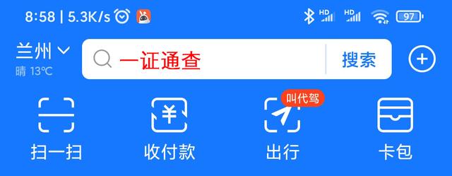 打开最新版支付宝,在顶部搜索栏中搜索一证通查。