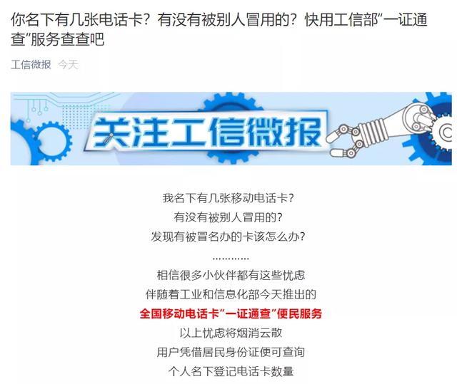 “一证通查”服务的开通,打破了93家省级基础电信企业和39家移动通信转售企业相关数据各自独立的局面,实现了全国移动电话卡的统一便捷查询,从根本上破除了手机卡查询难题,规避了不知情办卡的风险,为人民群众维护自身利益、保护个人信用提供了有效途径。