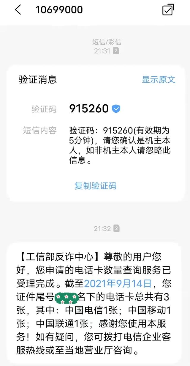 线上渠道:用户可以通过“工信微报”和“工信部反诈专班”微信公众号、运营商网上营业厅、中国信息通信研究院官方网站、支付宝“一证通查”小程序等线上渠道提交预约查询申请。48小时内,服务平台会通过“10699000”专用短信端口告知用户名下所有电话卡数量及其所属的运营企业。