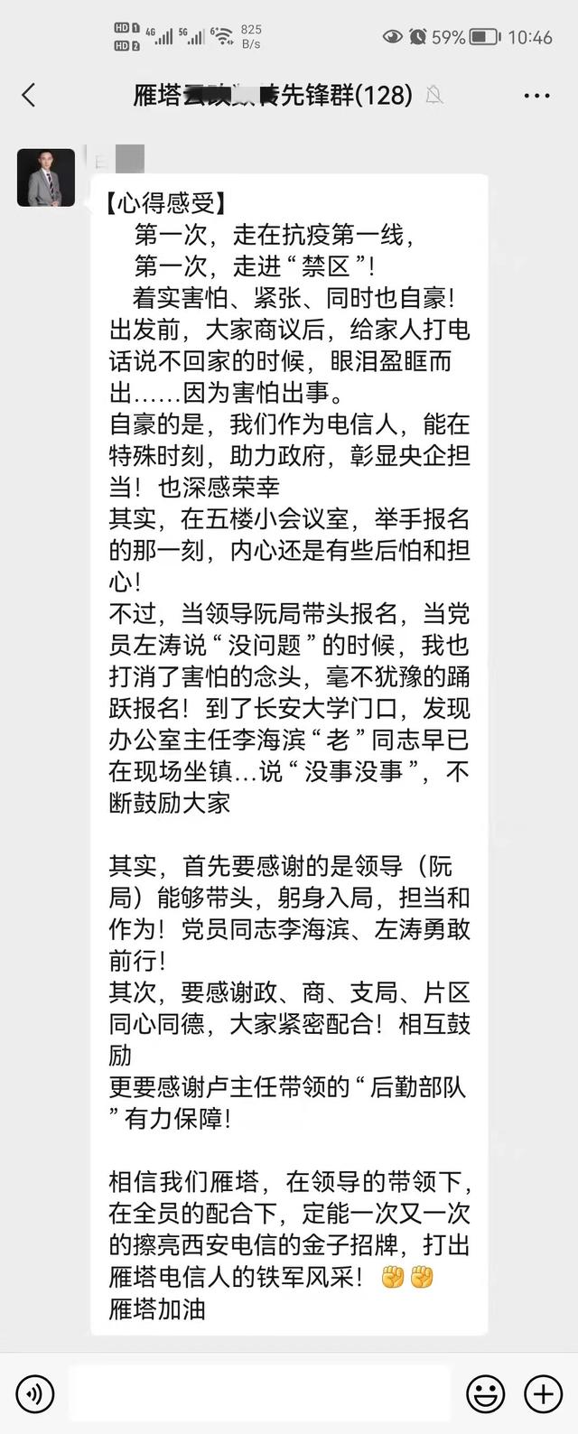 青年党员白雷雨说“着实害怕、紧张,同时也自豪!出发前,大家商议后,给家人打电话说不回家的时候,眼泪盈眶而出……因为害怕出事。自豪的是,我们作为电信人,能在特殊时刻,助力政府,彰显央企担当!也深感荣幸!”本轮疫情以来,在全员上下一心前后协同下,雁塔分局截至12月18日累计门磁安装1602套,全力为疫情防控贡献力量。