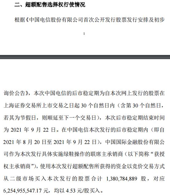 财联社(上海,编辑 陆鹿)讯,9月25日,中国电信发布公告,说明了发行人和联席主承销商行使超额配售选择权的情况,其中提到,在中国电信本次发行的后市稳定期内(即自2021年8月20日至2021年9月22日),中国国际金融股份有限公司作为本次发行具体实施绿鞋操作的联席主承销商(以下简称“获授权主承销商”),使用本次发行超额配售所获得的资金以竞价交易方式从二级市场买入本次发行的股票合计1,380,784,889股,对应6,254,955,547.17元,均以4.53元/股买入。