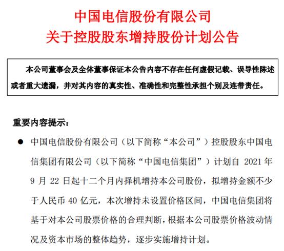 对于中国电信抛出的增持计划,机构的观点较为乐观。安信证券表示,控股股东增持,彰显公司发展坚定信心。截至2021年9月21日,中国电信集团持有中国电信57,377,053,317股A股股份,占已发行总股份的62.82%。假设按照发行价4.53元增持,中国电信集团预计将增持883,002,207股,使其持有公司A股股份达到58,260,055,524股,占已发行总股份的63.79%。控股股东增持公司股份,彰显了对公司发展前景的坚定信心以及对公司投资价值的高度认可,也有利于维护中小股东信心和市场稳定。