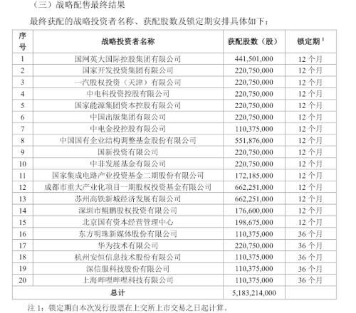 《国际金融报》记者注意到,根据中国电信披露的战略配售结果,20家战略投资者中,“最为慷慨”的当属成都市重大产业化项目一期股权投资基金有限公司以及苏州高铁新城经济发展有限公司,获配股数均为6.62亿股,其次是中国国有企业结构调整基金股份有限公司,获配5.52亿股,华为技术有限公司、国家开发投资集团有限公司、一汽股权投资(天津)有限公司等8家公司获配2.21亿股,排名第四。