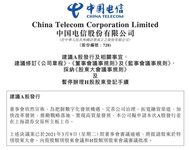 3月9日,中国电信(00728.HK)发布公告称:拟申请在上海证券交易所主板上市,拟公开发行不超过120.93亿股,占公司总股本不超过13%。