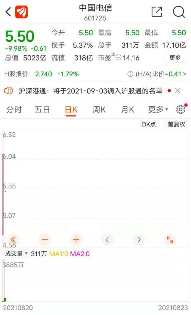 跌停,总在猝不及防时到来。8月23日,中国电信收报5.5元/股,跌停板的封单高达逾千万手,最新总市值5023亿元,较上个交易日缩水超557亿元。