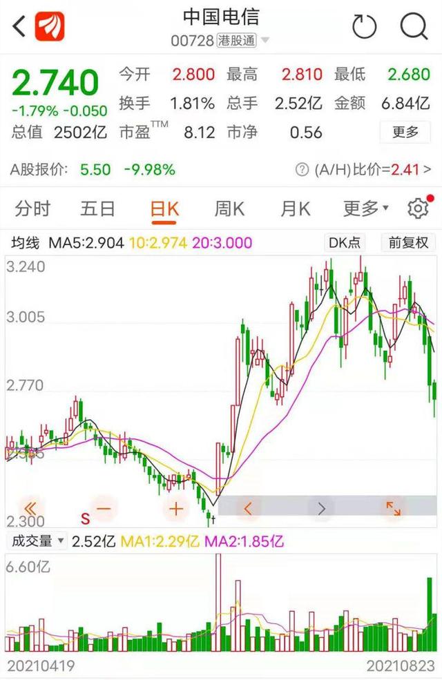 此外,当天中国电信港股的走向也不尽如人意,截至收盘下跌1.79%,报收2.74港元,这已经是其连续第四天出现下跌,累计跌幅近10%。