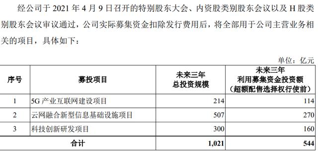 根据最新的招股说明书,中国电信拟用募集资金544亿元投资三个项目,分别为5G产业互联网建设项目、云网融合新型信息基础设施项目、科技创新研发项目。这三个项目未来三年总投资规模为1021亿元。
