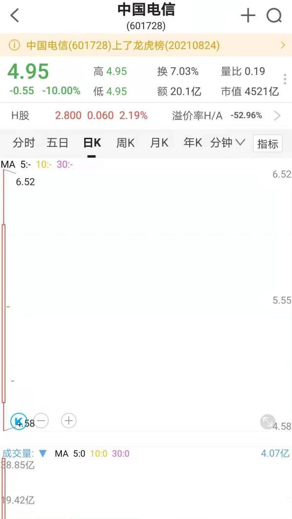 今日中国电信A股以4.95元/股的跌停价收盘。