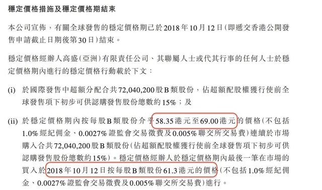 以港股美团-W为例,美团招股日期:2018.9.7-2018.9.12,发行价69HKD,2018.9.20日上市,稳定价格期结束是10月12日。美团9月20日港股上市后股价持续走低跌破发行价,其后续披露信息显示,发行券商于58.35港元至69.00港元之间合计购入超过7200万股。并且于2018年10月12日以61.3港元完成最后一笔交易。