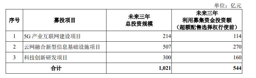 根据招股说明书,此次IPO,中国电信拟募集544亿元资金,主要用于三个募投项目:5G产业互联网建设项目、云网融合新型信息基础设施项目、云网融合新型信息基础设施项目。