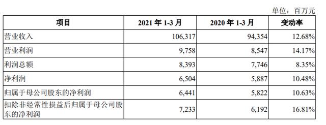 招股说明书显示,2021年第一季度,中国实现营业收入 1,063.17 亿元,较上年同期增长12.68%;净利润65.04 亿元,较上年同期增长10.48%;归属于母公司股东的净利润64.41亿元,较上年同期增长10.63%;扣除非经常性损益后归属于母公司股东的净利润72.33亿元,较上年同期增长16.81%。
