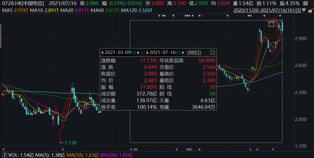 今年3月9日,中国电信公告宣布将申请A股发行并在上海证券交易所主板上市。这意味着,从宣布回A到确定上会,仅用时4个月。自宣布将回归A股后,中国电信H股总体呈现上涨趋势,截至7月16日收盘,涨近20%。