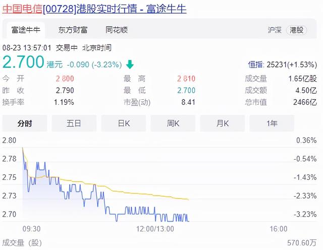 中国电信H股也在阴跌。截止13:57,公司H股股价跌超3%,一直在低位徘徊。
