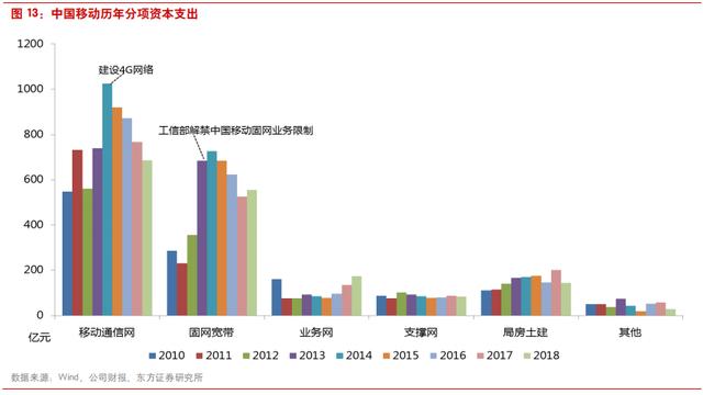 支撑网:中国电信自获得移动通信牌照后,该项投入逐步稳定增加。近三年计费管理系统的搭建完善,该项支出逐步回落。