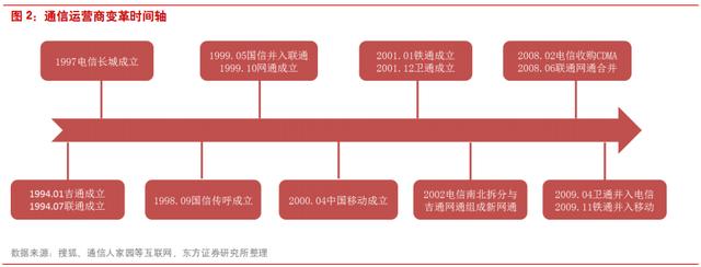 第二阶段(2002-2008):2002年,中国电信按照骨干网进行南北分拆,新中国电信继承南方和西部 21 省业务,北方 10 省业务由中国网通继承。随即吉通公司与中国网通合并,成立新的中国网通公司,在这段时期内,我国电信运营商行业几经分拆合并,最终形成了中国电信、中国网通、中国移动、中国联通、中国铁通和中国卫通的“5+1”格局。