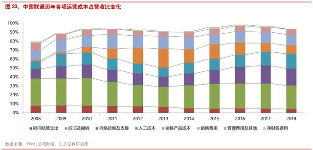 折旧与摊销:中国联通 2018 年该口径成本为 763 亿,营收占比约为 26.2%。近年来随着网络规模的扩大以及营收的增长略有波动,平均约在 28%附近。