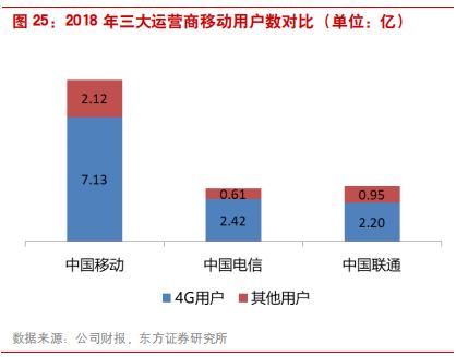 中国移动已经在 4G 领域形成了绝对的领先优势,在网络覆盖方面,中国移动已经完成了全国 99%的人口覆盖,截止 2018 年全国拥有 241万个 4G 基站,超越中国电信和中国联通 4G 基站数量之和。得益于网络基础资源方面的优势,中国移动 4G 用户数量累计达到 7.13 亿,牢牢占据市场第一份额。