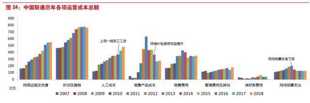销售产品成本:2018 年该口径成本为 248 亿,营收占比约为 6.6%,包括移动终端成本和移动终端补贴两类。近来年随着移动终端补贴大战的降温,该项支出在呈现逐年下降的趋势。
