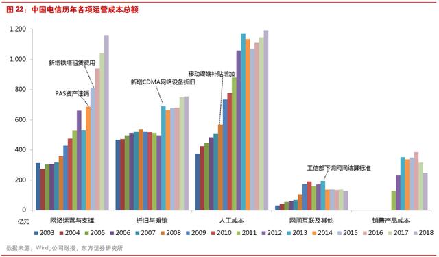 折旧与摊销: 2018 年该口径成本为 755 亿,营收占比约为 20.0%。2012 年由于新增 30 个省市的 CDMA 网络资产,折旧与摊销有所上升,此后基本维持在 20%附近。