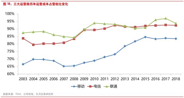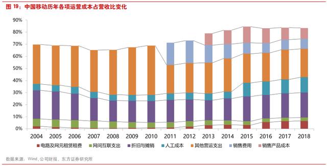 人工成本:2018 年该口径成本为 1191 亿,营收占比约为 31.6%。2014 年以前,该口径包含职工薪酬和移动终端补贴。2014 年将移动终端补贴口径剥离,此后该口径成本率基本稳定。