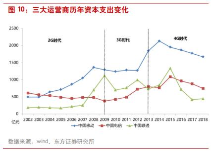 资本支出是驱动运营商业务创新,行业不断成长的重要因素,也是产业链公司十分关切的项目。在本节,我们对三家运营商的资本支出按照技术创新周期进行划分,研究结果表明: