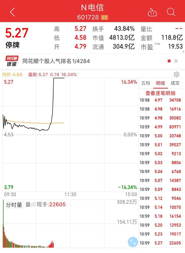 从盘面来看,中国电信发行价格为4.53元,交易首日开盘前的集合竞价阶段一度达到5.44元,但没坚持多久就开始下跌,最终开盘价4.79元,之后最低跌至4.58元,接近破发边缘。