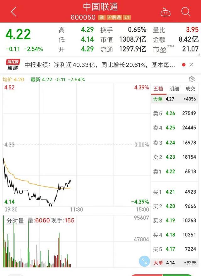 中国电信上市也未给中国联通(600050.SH)带来“振奋”。8月20日中国联通开盘表现萎靡,从开盘4.29元一路下跌。