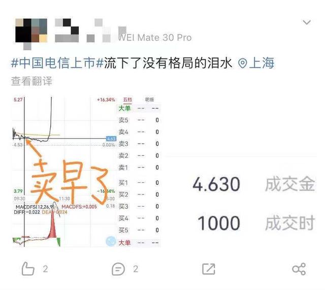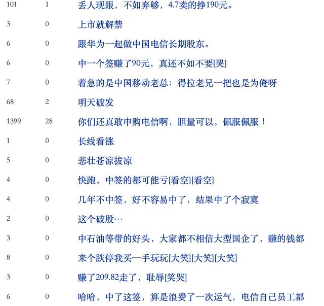 然而早盘表现后,中国电信上市登上热搜,股吧的股民和部分散户心态崩塌。有股民称“几年不中签,好不容易中了,结果中了个寂寞。”