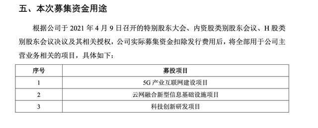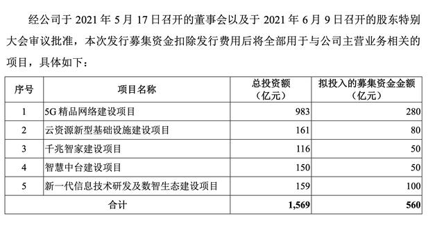 中国移动招股书显示,此次募投项目为5G精品网络、云资源新型基础设施、千兆智家、智慧中台、新一代信息技术研发及数智生态等5大建设项目,其中拟投入募集资金金额560亿元,总投资金额1569亿元。