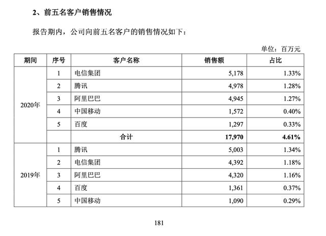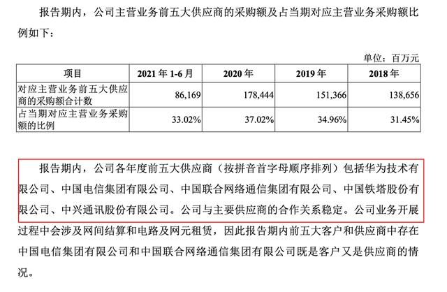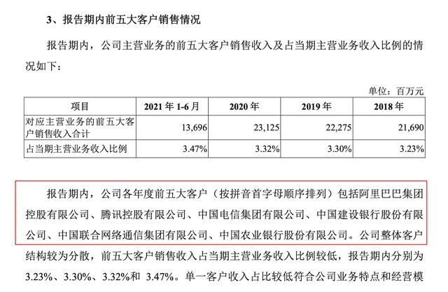 根据招股书,2018年~2021年6月,中国移动的前五大客户分别是阿里巴巴、腾讯、电信集团、中国建设银行、中国联通、中国农业银行;前五大供应商则是华为、中国电信、中国联通、中国铁塔、中兴。
