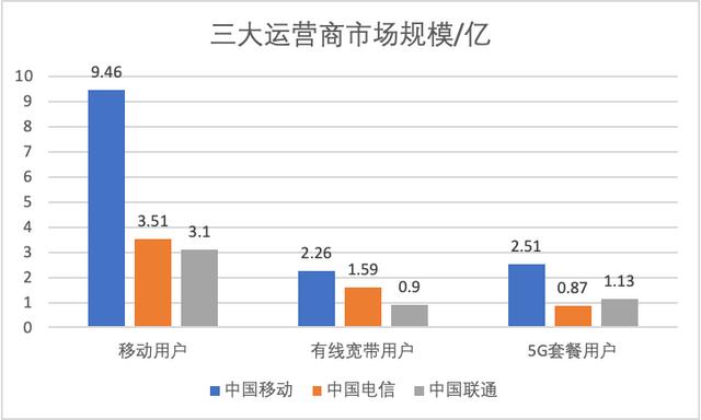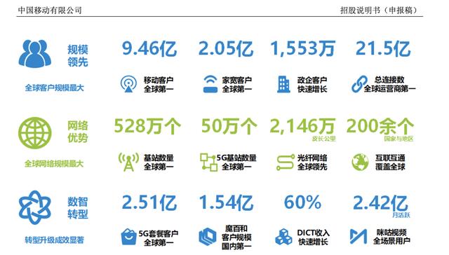 根据中国移动披露的招股书,截至2021年6月末,其移动客户数为9.46亿户,国内市场份额为58.42%,规模为全球第一;有线宽带客户为2.26亿户,国内市场份额为47.01%;5G套餐客户数达2.51亿户,规模也居全球第一。