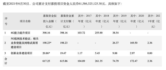 另外,2017年中国联通以6.83元/股的价格向特定对象非公开发行A股股票,共募集资金净额达615.46亿元,截至2021年6月30日,募集金额已全部用完,但由于当时5G还未普及,这几年中国联通将大部分资金放在了4G能力的提升上,共花费资金398.16亿元,而在5G相关业务上共投入198.23亿元。