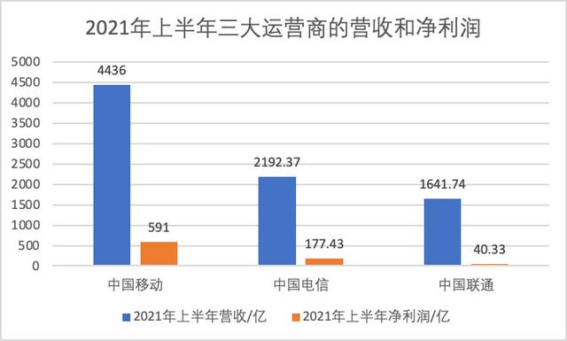 中国移动2021年上半年的营收为4436亿元,中国电信和中国联通上半年则分别实现营收2192.37亿元和1641.74亿元。