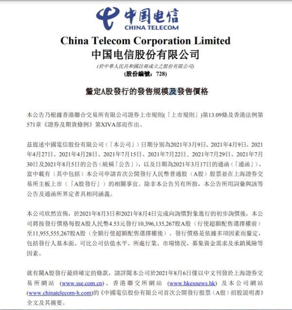 8月6日,中国电信发布公告称,本次发行的初步询价工作已经完成,确定的发行价格为4.53元/股。