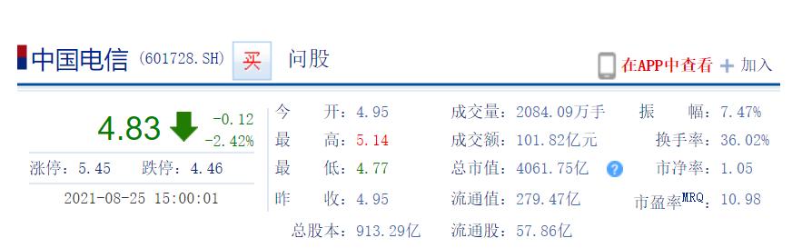 截至8月25日记者发稿时,中国电信股价为4.83元/股,市值也从第一日的5580.17亿元降至4061.75亿元。