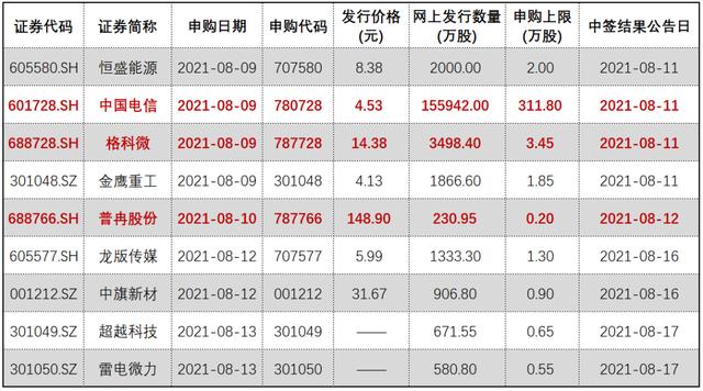 根据新股发行安排,“巨无霸”中国电信将于今日(8月9日)正式启动网上申购,网上申购代码为780728,发行价格为4.53元/股,网上申购数量上限高达311.8万股,顶格申购需要沪市市值3118万元,是新股申购规则以来顶格申购上限最高的新股,也或将成为A股最容易中签的新股。