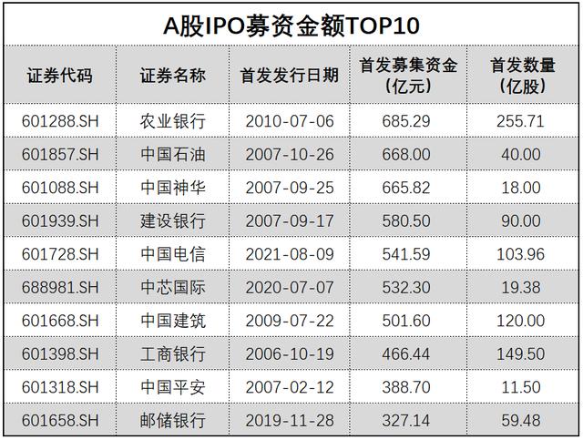 从IPO募资金额来看,若超额配售选择权全额行使,中国电信的募资总额将达541.59亿元,将成为A股历史上第五大IPO。